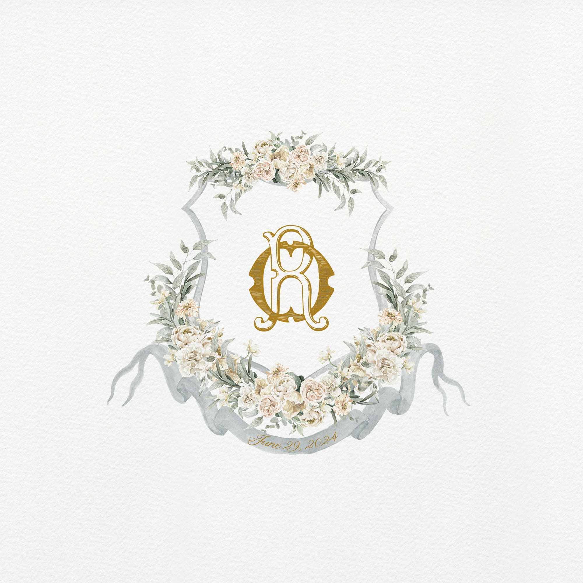 Blue and Gold Watercolor Wedding Crest Monogram Interlock